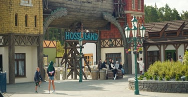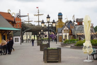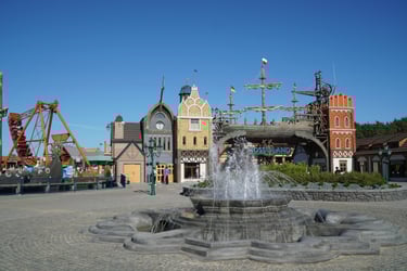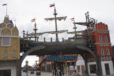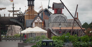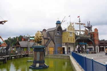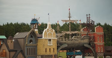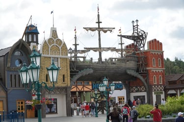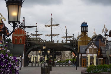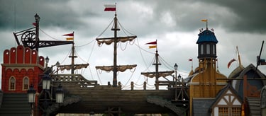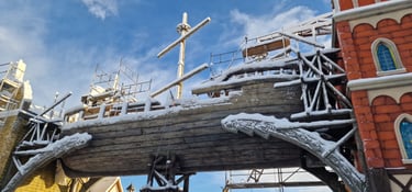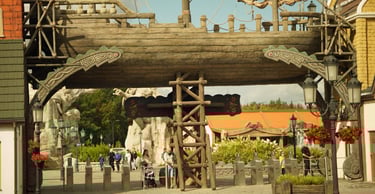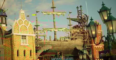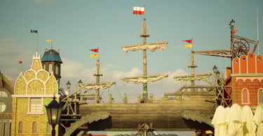 A colossal legendary vessel said to have sailed from the lost realm of Baltambrya. After surviving storms, battles and centuries at sea, the giant ship now rests dramatically between two town towers, suspended on massive beams as if wedged into the city itself. Visitors pass beneath its hull to enter a world of adventure, mystery and imagination.