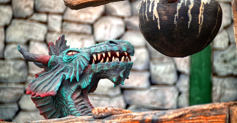 Smoke-breathing dragon landmark created to transform a themed dining area into a memorable guest experience.