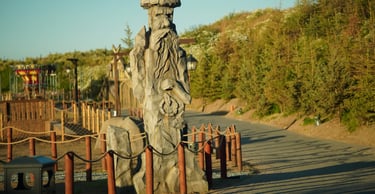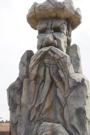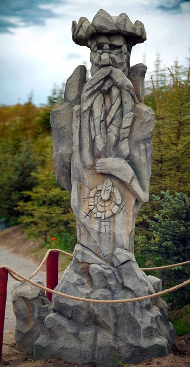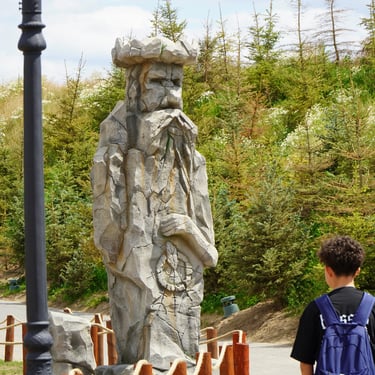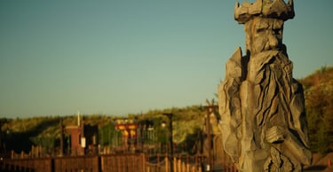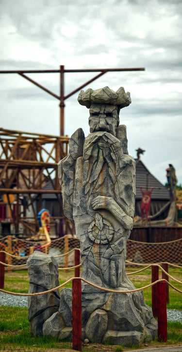Two towering stone druids standing guard at the threshold between worlds. Created as a dramatic transition landmark between the Fish Market District and the Viking Zone, these monumental sculptures transform an ordinary pathway into a memorable guest experience.