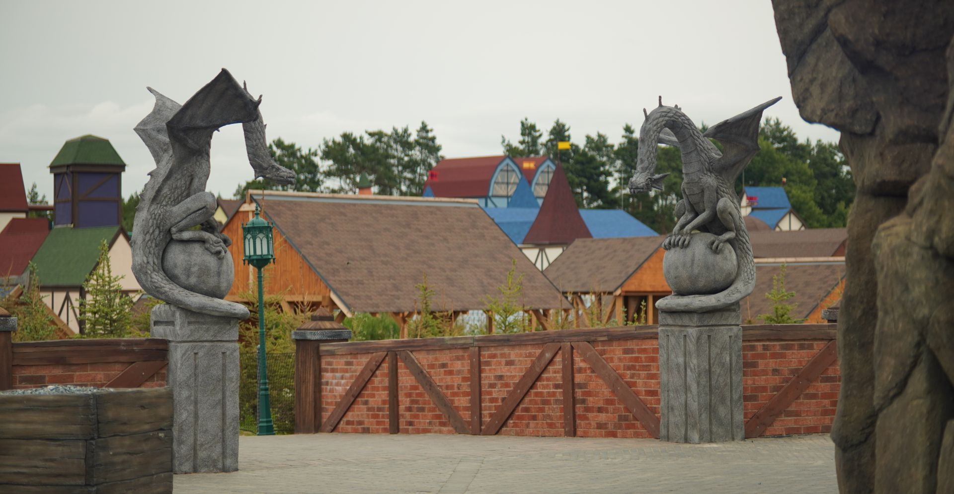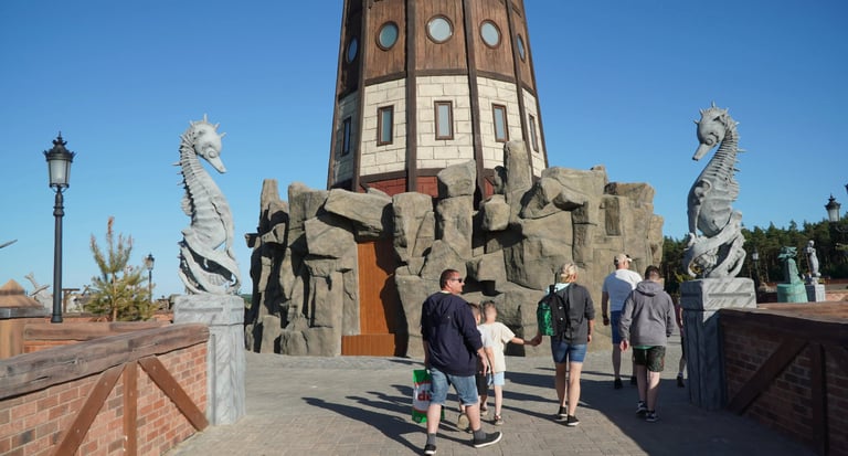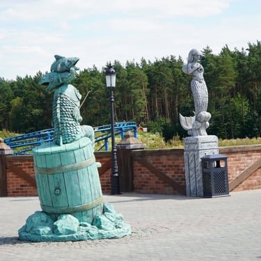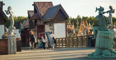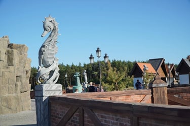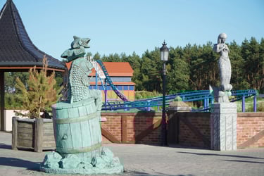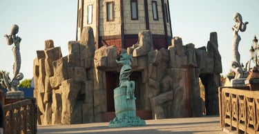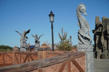 Designed as the symbolic center of the park, this plaza connects four themed worlds, each guarded by a pair of sculptures, and features a unique fisherman character.