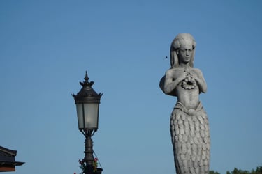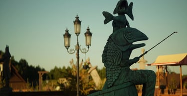 A whimsical fisherman-fish sculpture adds a touch of mystery and humor to the plaza’s center, making it a guest favorite