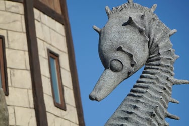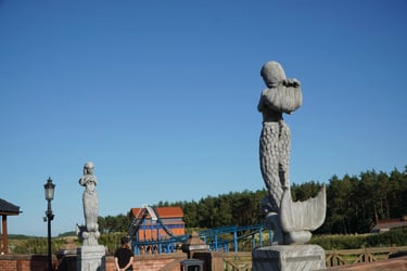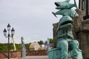 Landmark central plaza created with eight guardian sculptures and the iconic fisherman character at Hossoland.